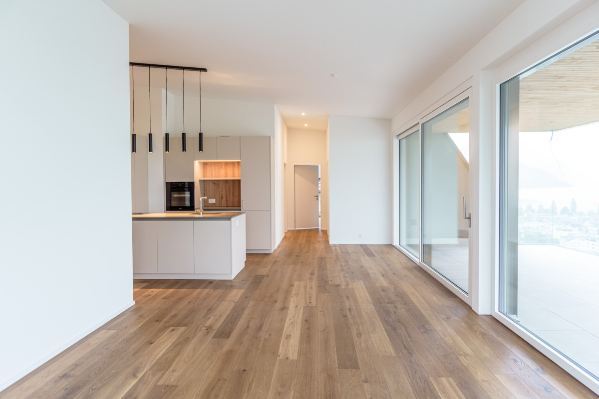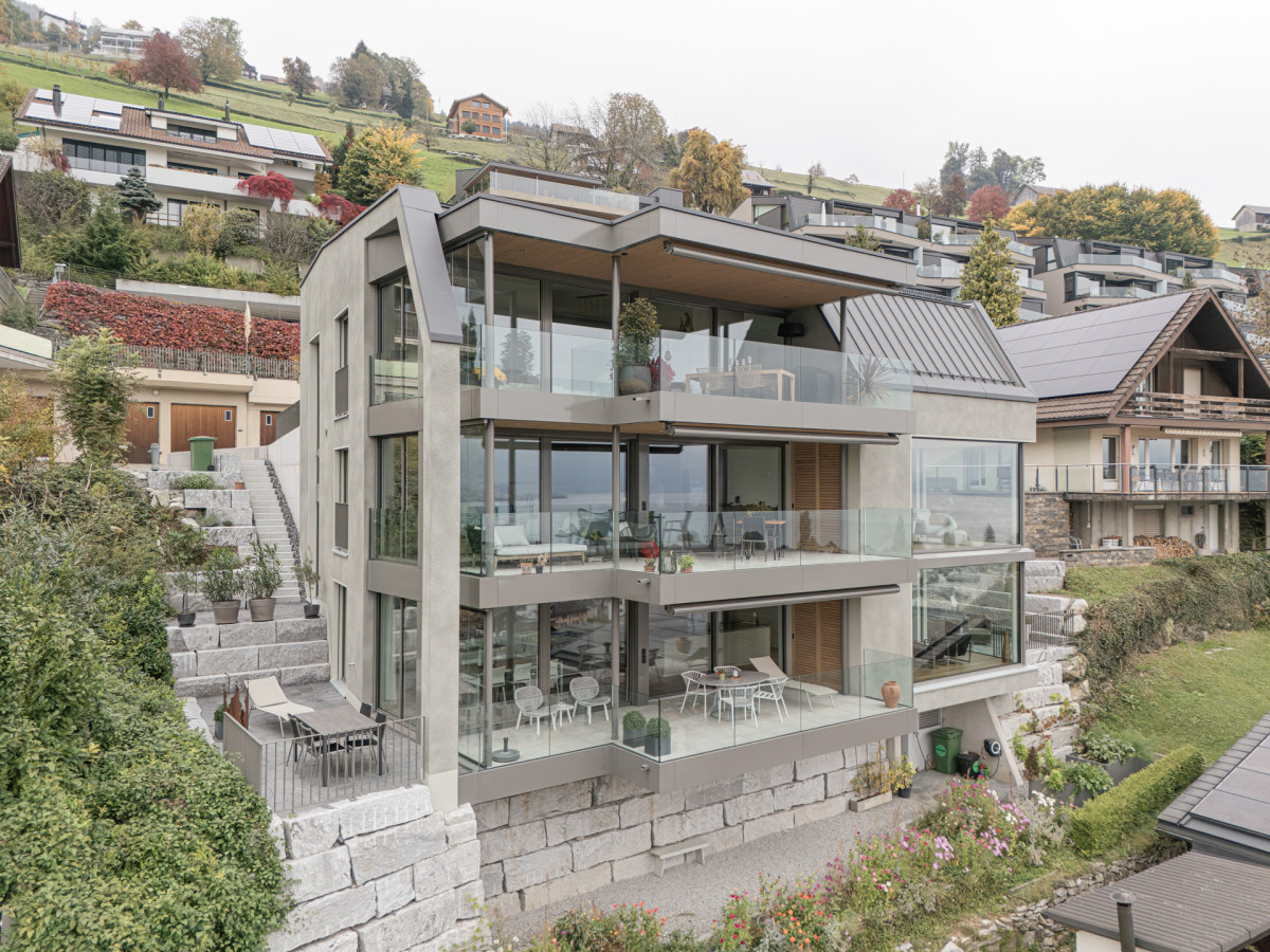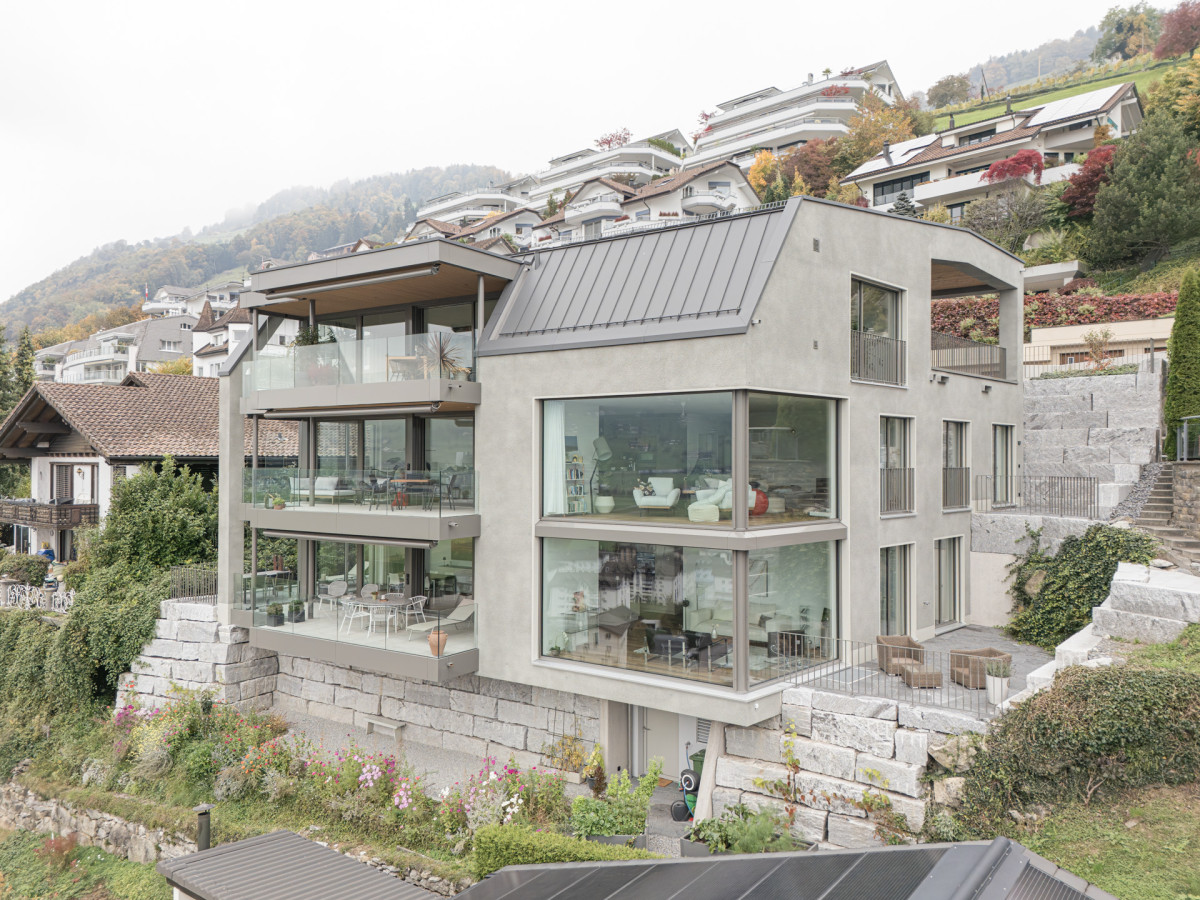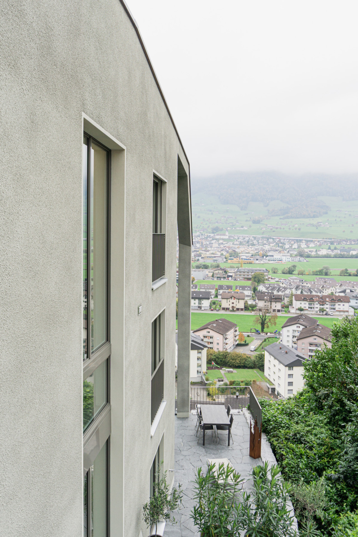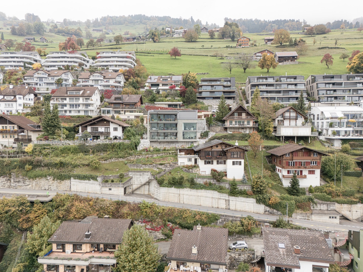 Die Geometrie des Gebäudes wird stark durch die Grundstücksform, sowie durch die Lage der Erschliessung geprägt. So auch die unkonventionelle Dachform, welche sich mit seiner Form in die Umgebung eingliedert.