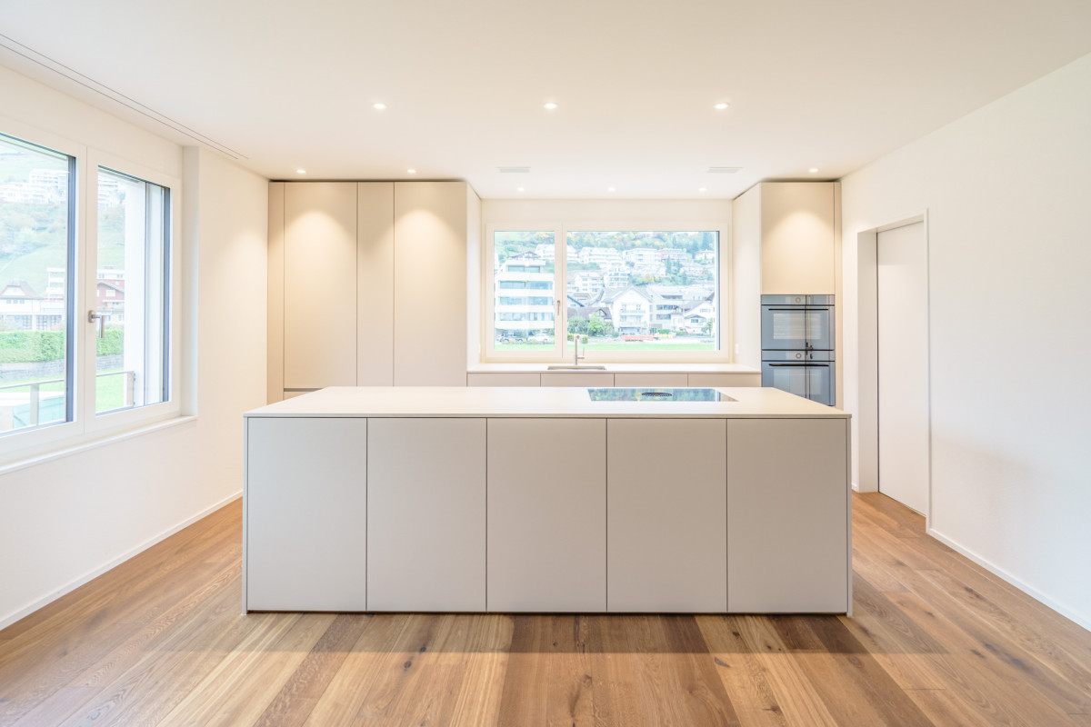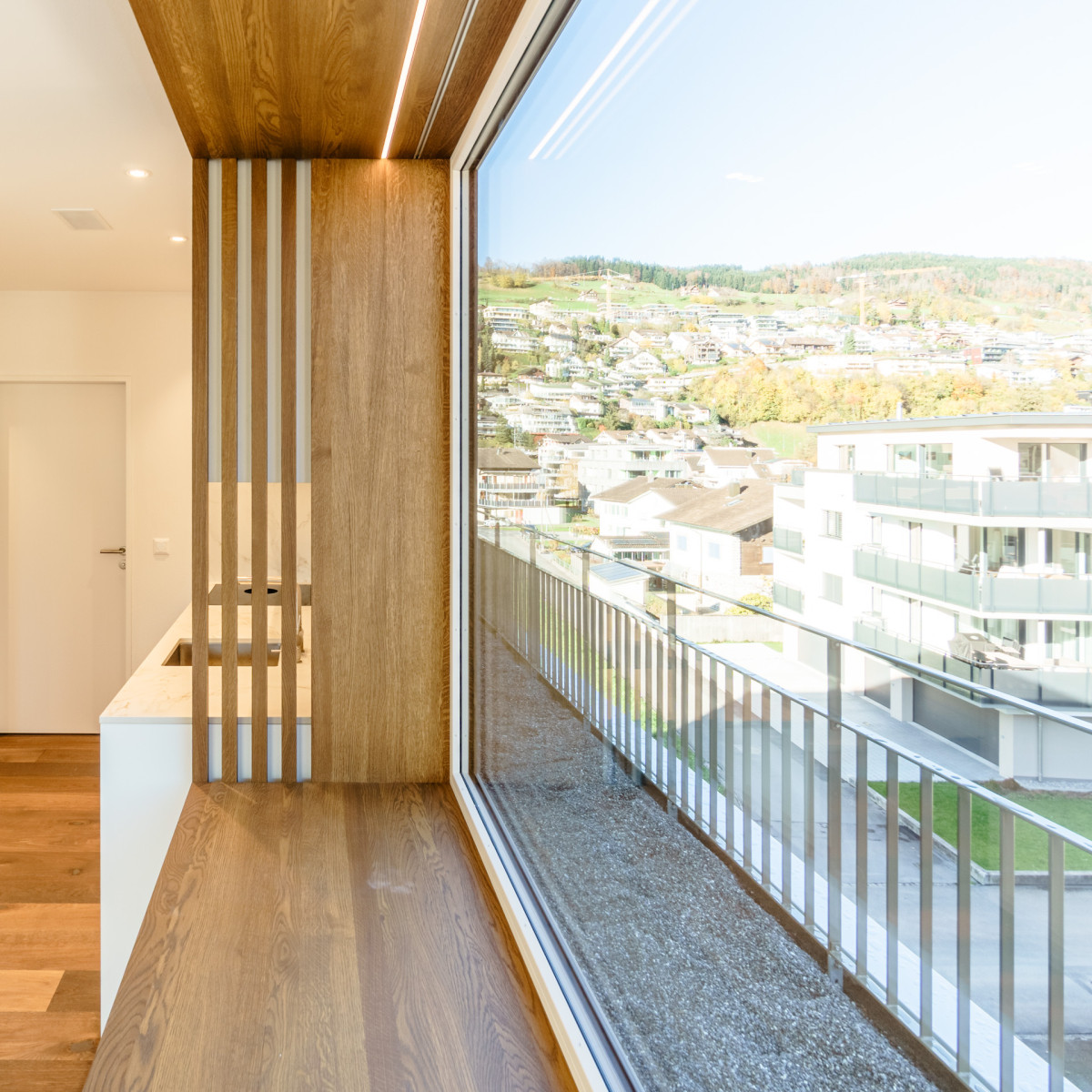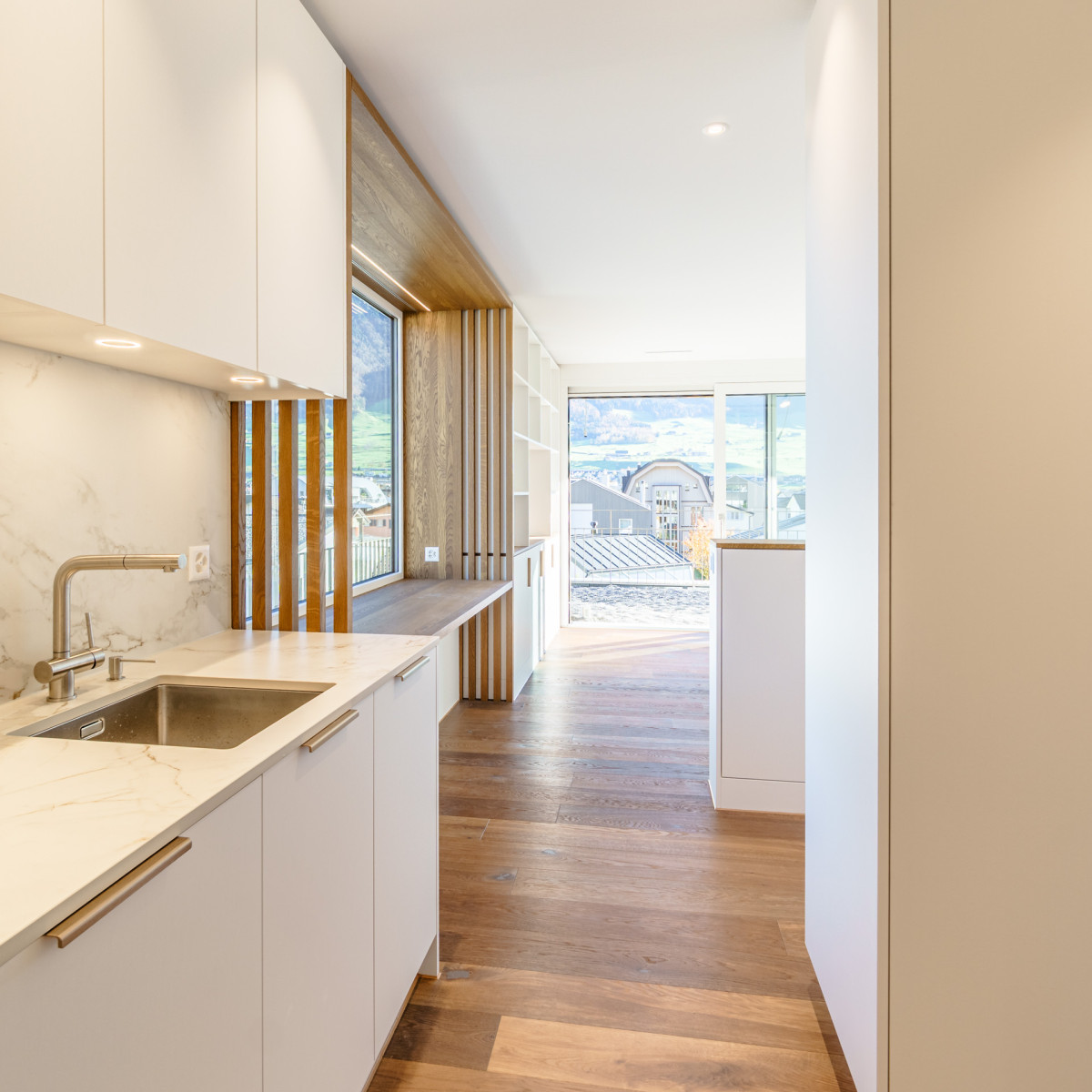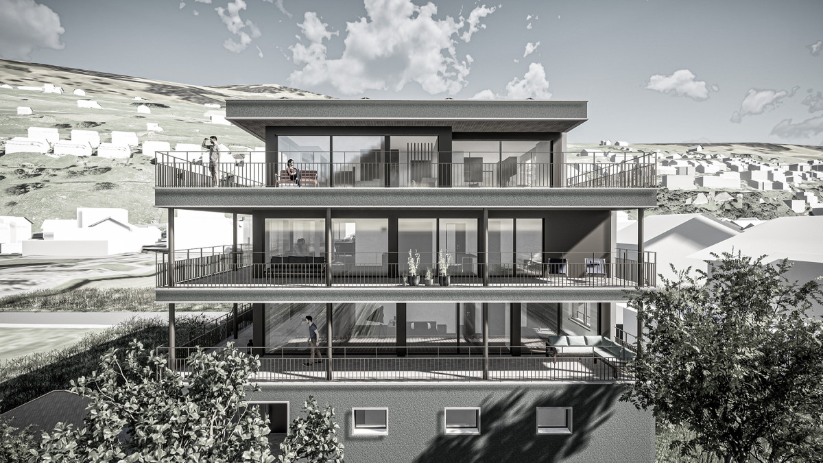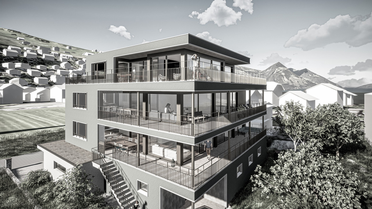 Die schlichte, kubische Bauform integriert die Terrassen in das Gebäudvolumen, welche eine nahtlose Verbindung zwischen Innen- und Aussenraum herstellen, ohne die klaren Linien des Gebäudes zu unterbrechen.