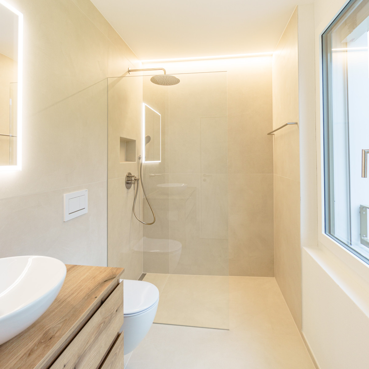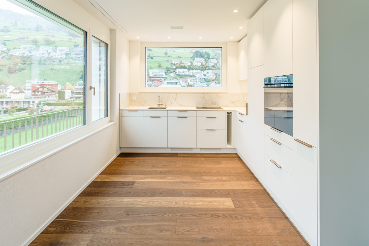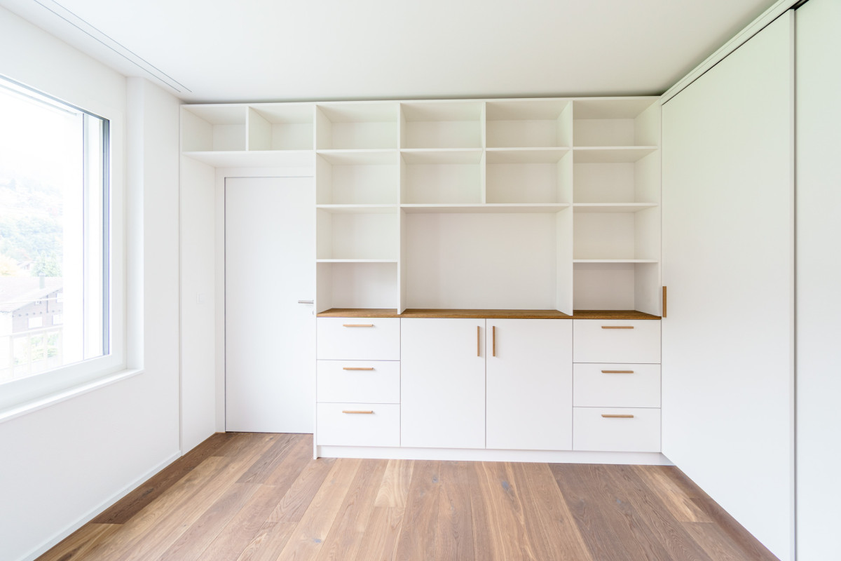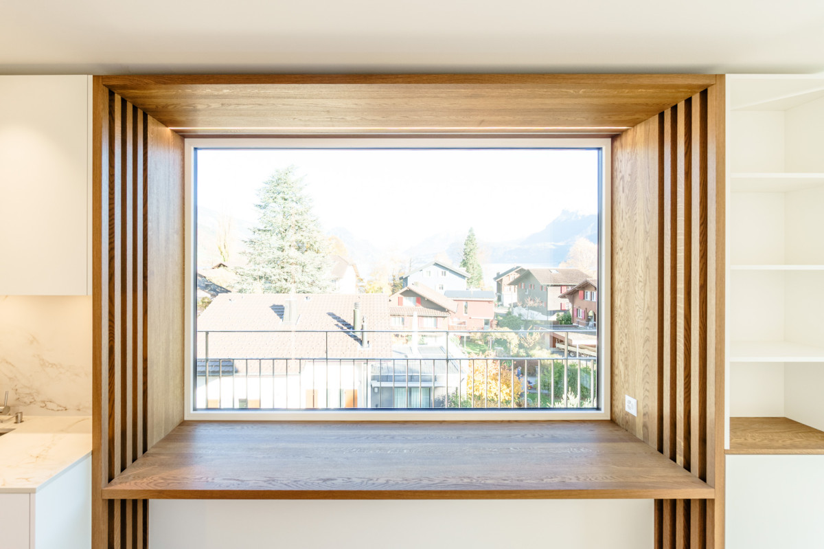 Die schlichte, kubische Bauform integriert die Terrassen in das Gebäudvolumen, welche eine nahtlose Verbindung zwischen Innen- und Aussenraum herstellen, ohne die klaren Linien des Gebäudes zu unterbrechen.