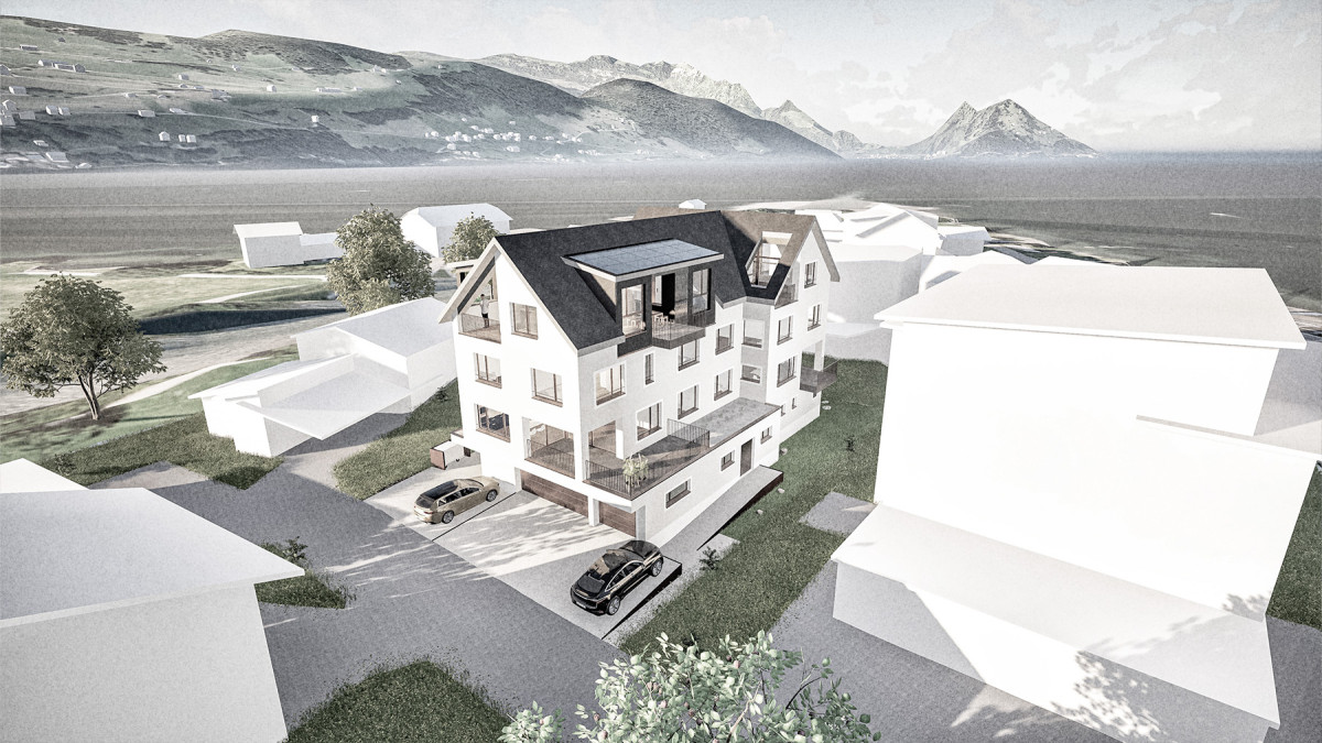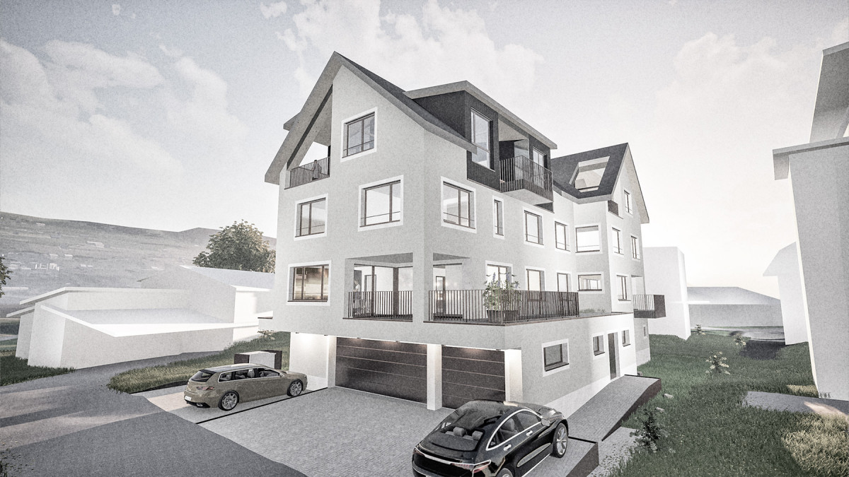 Das bebaute Grundstück wird im Sinne einer inneren Verdichtung neu entwickelt. Es entsteht ein Mehrfamilienhaus mit vier Wohneinheiten. Das Gebäude besteht aus zwei Hauptkörpern mit Giebeldächern, welche quer zueinander stehen. Die Aussenräume sind als innenliegende Balkone in die Gebäudekörper integriert, die Dachaufbauten farblich und materiell an die Dächer angepasst.