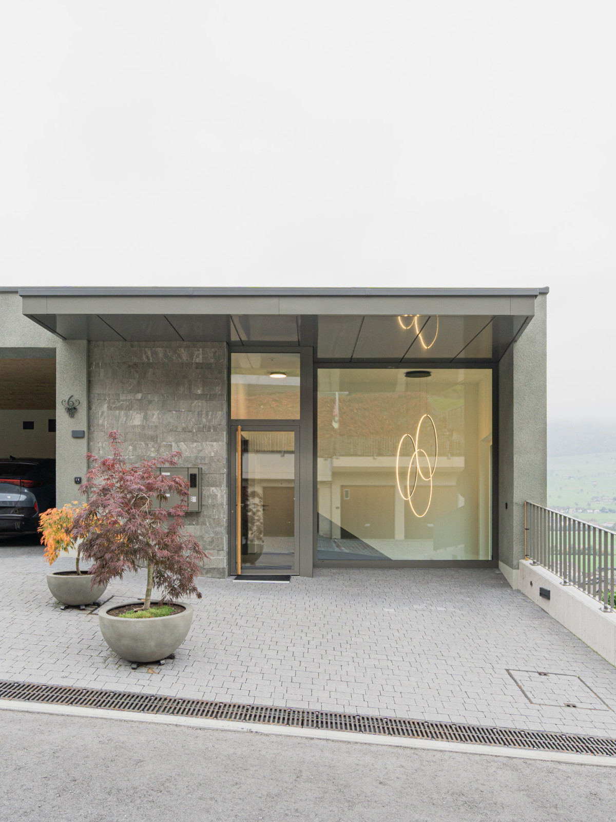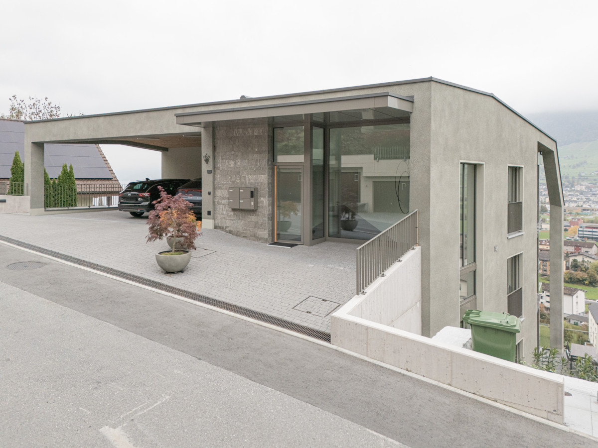 Die Geometrie des Gebäudes wird stark durch die Grundstücksform, sowie durch die Lage der Erschliessung geprägt. So auch die unkonventionelle Dachform, welche sich mit seiner Form in die Umgebung eingliedert.